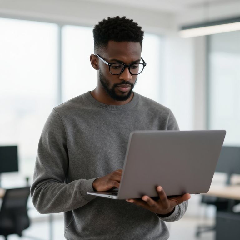 Photograph of a bald, bearded man in a blue shirt, typing on a laptop in a sunlit office, focused expression.