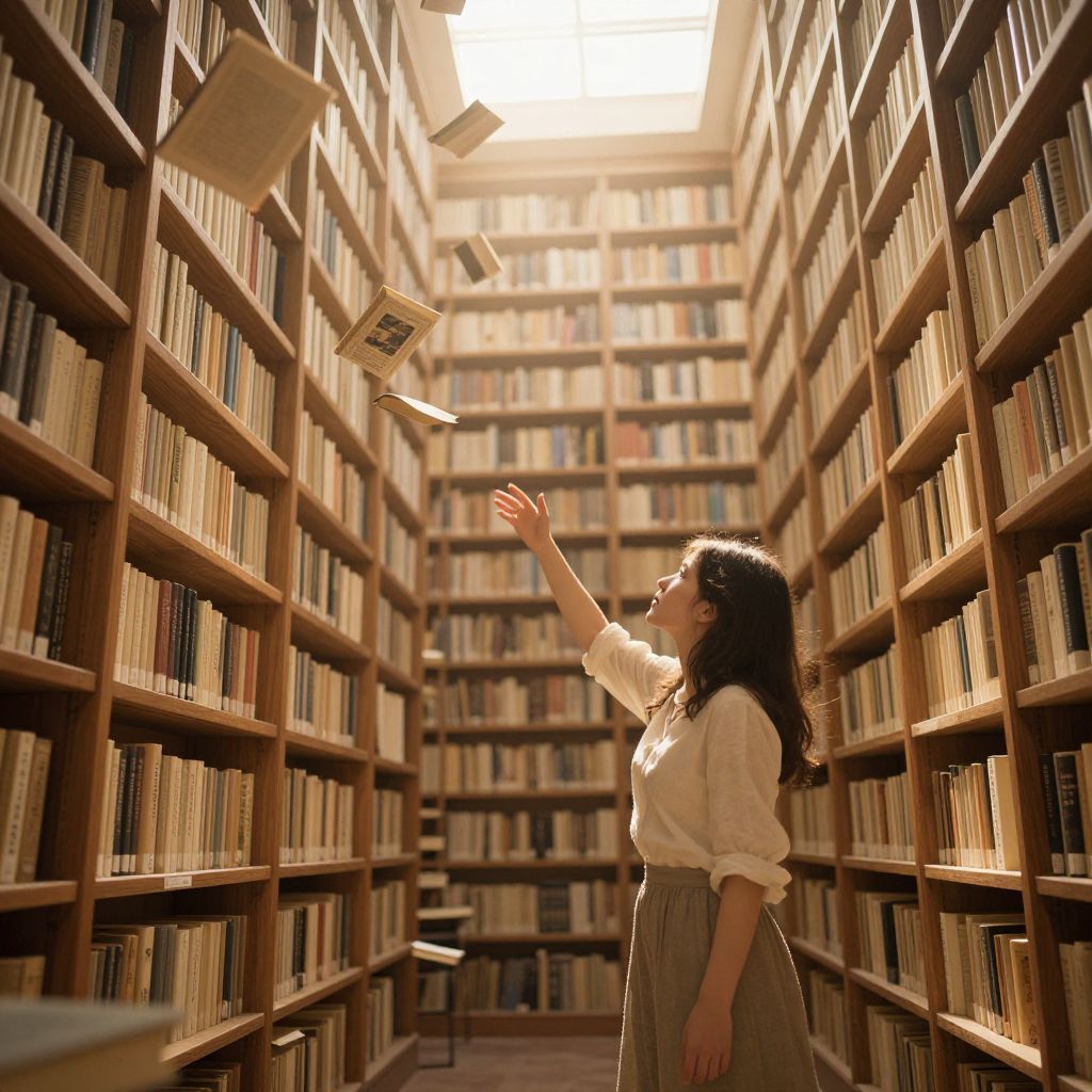 In a surreal library bathed in golden light, books take flight like birds, soaring between endless shelves as a young woman reaches out, chasing the fleeting stories they carry.