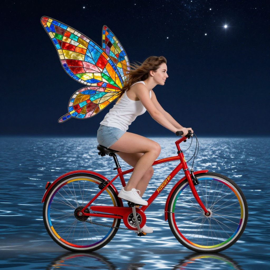 A young woman with vibrant stained-glass wings gracefully pedals a red bicycle adorned with colorful wheels, riding effortlessly across a shimmering water surface under a starry night sky.