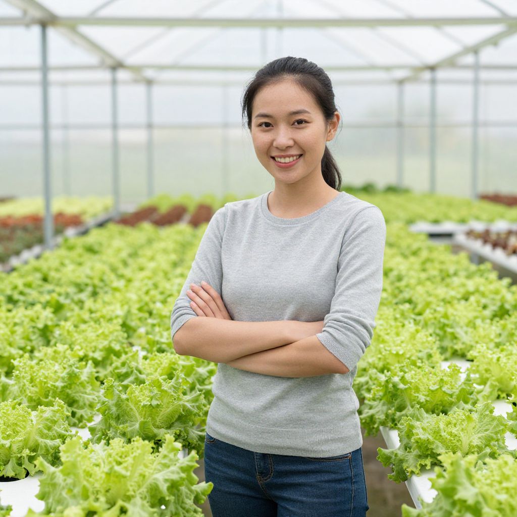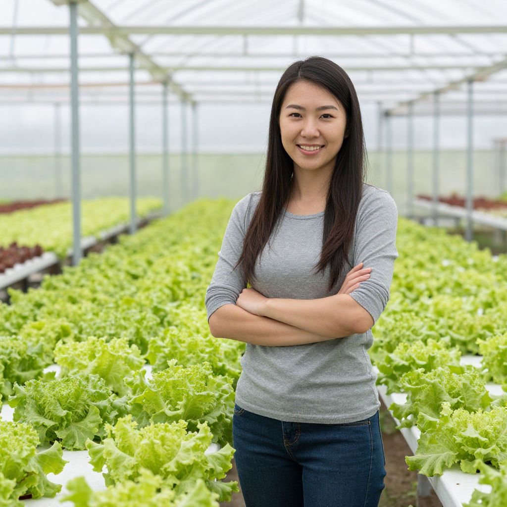 Photograph of an Asian woman with long black hair, standing confidently in a greenhouse with green leafy lettuce plants in the background. She is smiling, wearing a light gray, long-sleeved shirt and dark blue jeans, with her arms crossed. The greenhouse has a white, translucent roof and is well-lit. Rows of lush, green lettuce plants fill the foreground and background, creating a repetitive, orderly pattern. The woman is centered in the frame, with the lettuce plants extending into the distance. The overall mood is fresh and productive.