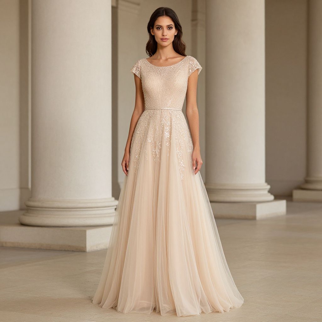 Elegant woman standing gracefully in a champagne-colored long prom dress featuring a round neckline, intricate sequin embellishments, and a flowing tulle skirt, set against the backdrop of classical columns in a grand indoor setting.