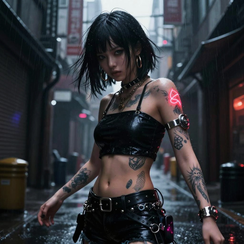 Short hair goth portrait featuring pale skin, black lipstick, intricate tattoos, dark eyeliner, wearing a velvet choker, standing in a neon-lit alley with mist