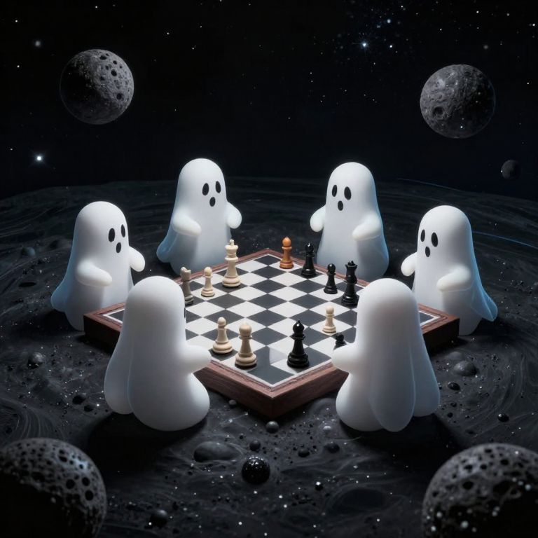 Digital artwork depicting six white, ghost-like, cartoonish figures with black oval eyes playing a chess game on a checkered board in a dark, cosmic setting. The board and pieces are illuminated, contrasting against the dark, textured background with scattered asteroids. The ghosts are evenly spaced around the board, each focused on their moves. The background features a starry sky, enhancing the surreal, otherworldly atmosphere. The chess pieces are in mid-game positions, suggesting active play. The scene is whimsical and eerie, combining elements of space and supernatural.