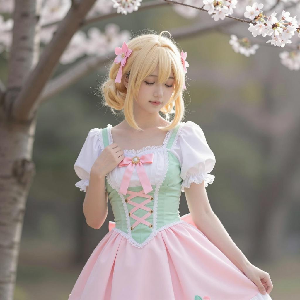 Usagi costume, photorealistic, cute young girl, long blonde hair, green eyes, wearing pink bunny hooded sweatshirt, large pink ears with pink inner ears, blue ribbon bow on chest, soft pink fur ure, daylight, urban street background, blurred storefronts, sunlight, girl looking directly at camera, slight blush on cheeks, soft shadows, realistic details, casual street photography style