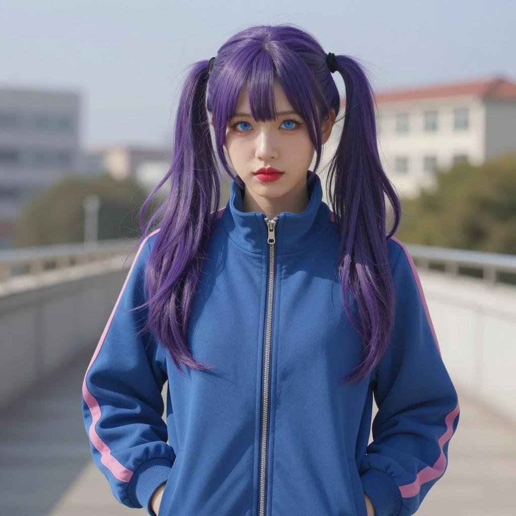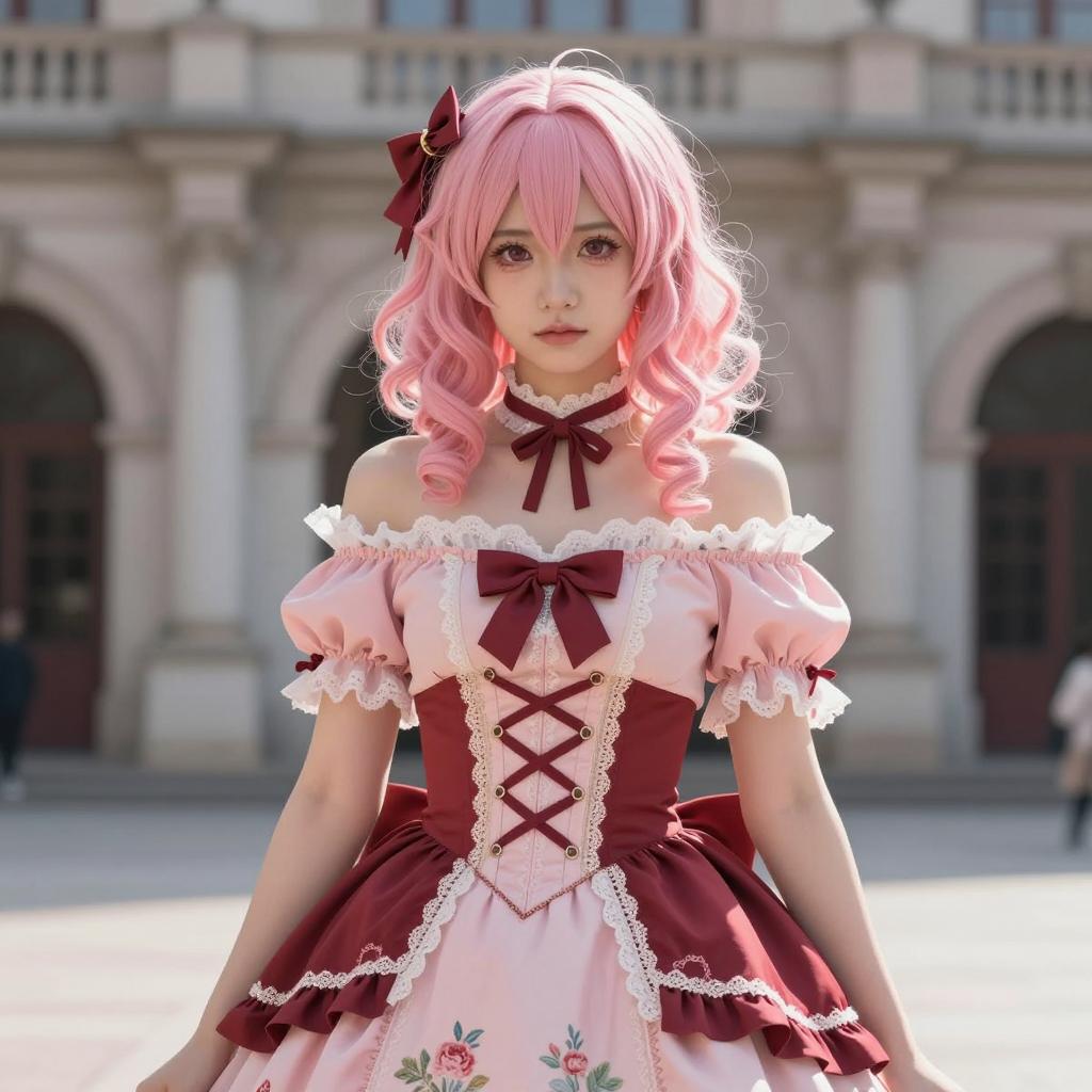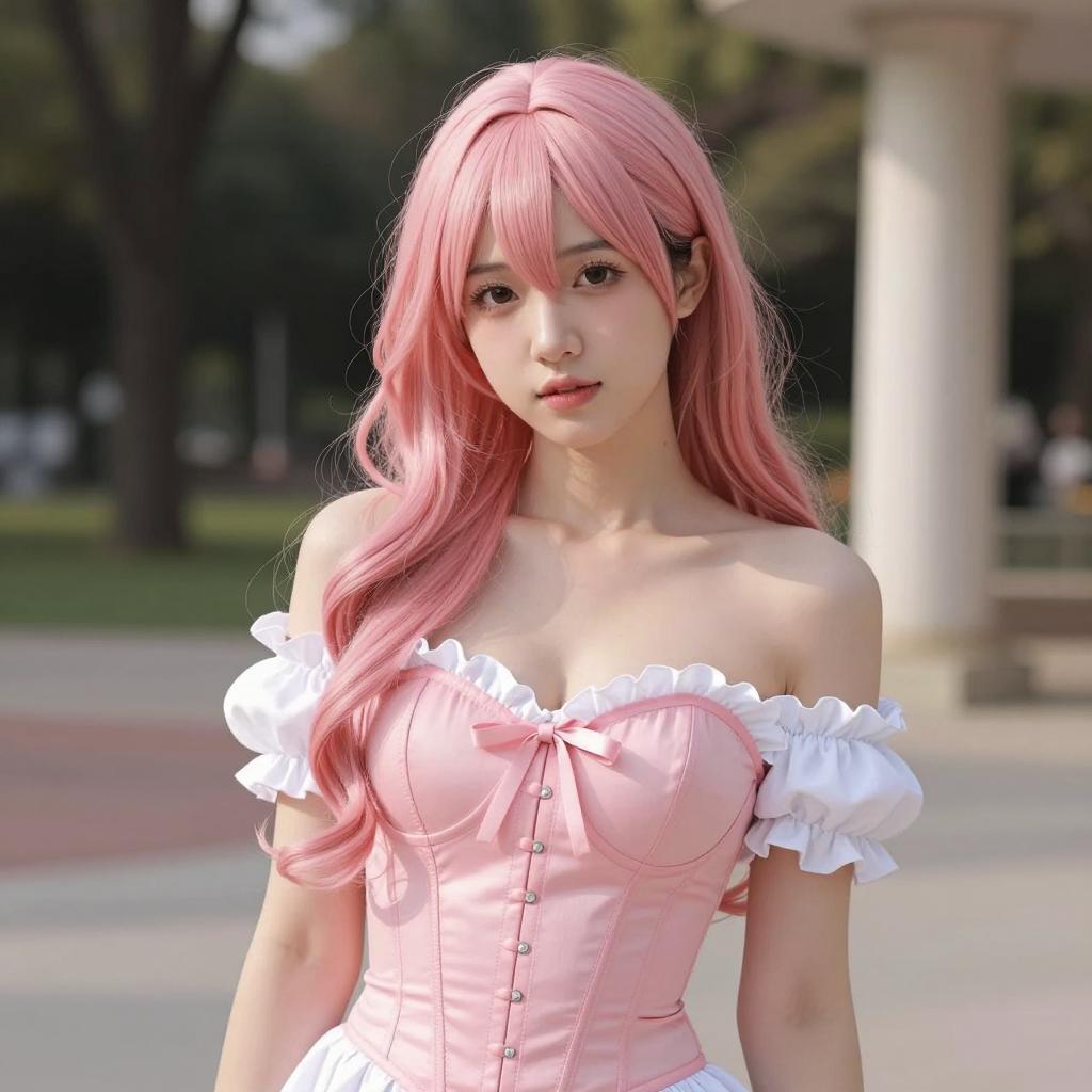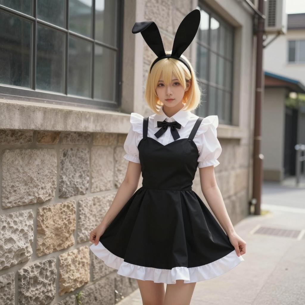 Young Woman in Pink Bunny Hoodie with Blue Bow