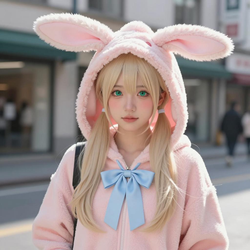 Photorealistic image of a young woman with long blonde hair and green eyes wearing a soft pink bunny hooded sweatshirt with large pink ears and a blue ribbon bow on the chest. She has a slight blush on her cheeks and is standing outdoors on an urban street with blurred storefronts in the background, captured in daylight with soft shadows.