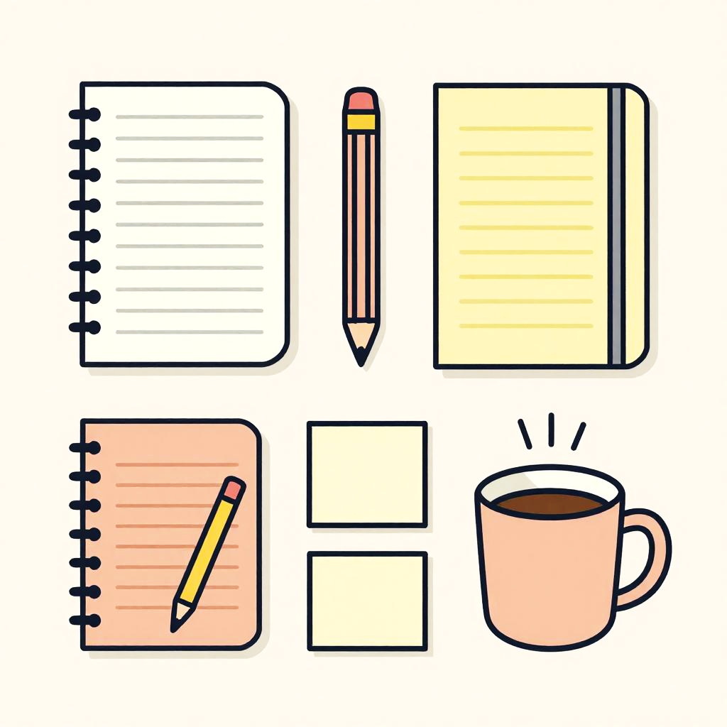 A collection of illustrated office supplies arranged neatly including two spiral notebooks in pastel colors, two pencils, two sticky notes, and a coffee mug with steam, all featuring smooth outlines and soft pastel tones for a clean, minimalist aesthetic.