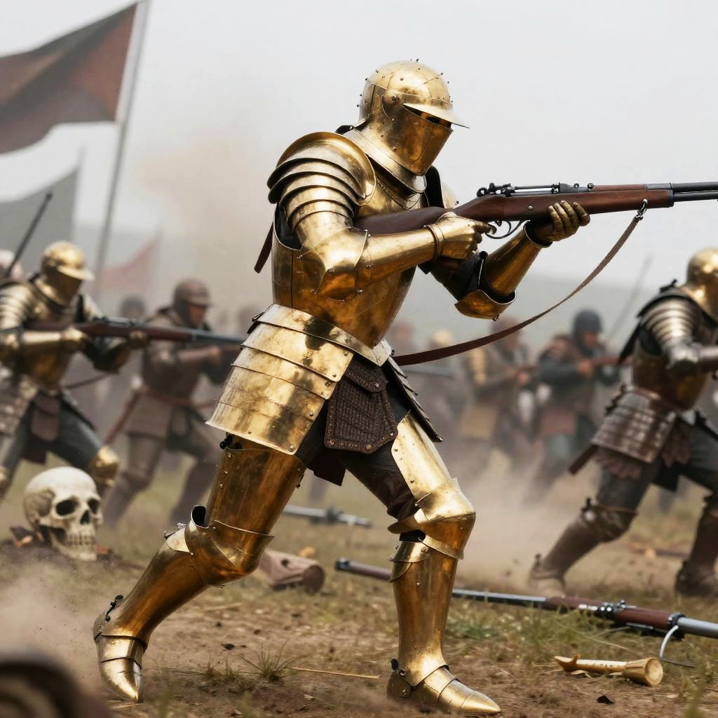 Photorealistic CGI: Golden-armored medieval warrior with rifle, lunging forward in battle. Background: Smoky battlefield, flag, other armored soldiers