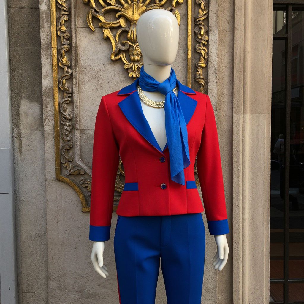 Photograph of a mannequin dressed in a vibrant red blazer with royal blue trim and buttons, paired with matching royal blue pants. The mannequin also wears a loose, royal blue scarf around its neck and a gold chain necklace. The background features an ornate, golden, baroque-style wall decoration on a stone wall, with a glass door partially visible on the right. The mannequin's head is blank and white, lacking facial features. The textures include the smooth, synthetic fabric of the blazer and pants, and the detailed, textured stone wall behind.