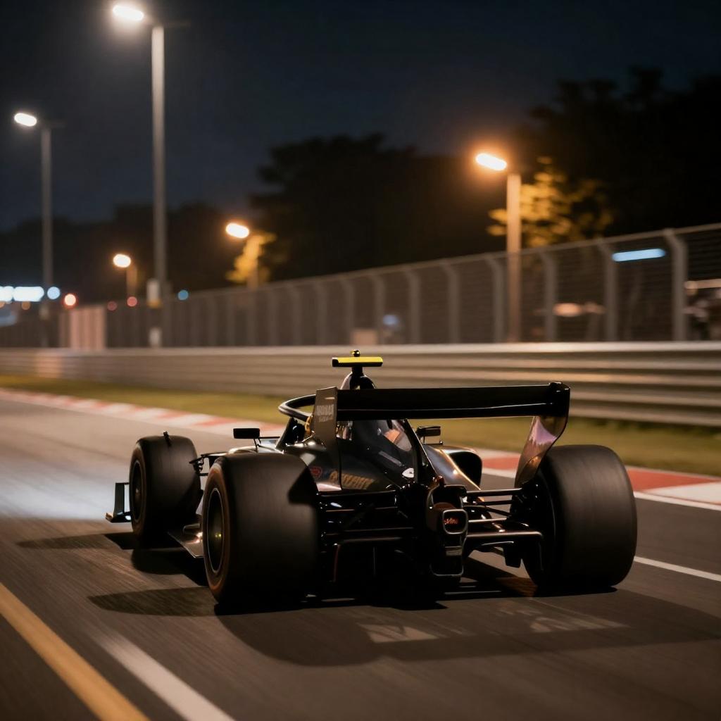 Photograph of a black racing car speeding on a track at night, with blurred orange and yellow lights in the background. The car has a prominent rear wing and is centered in the frame. The track is illuminated by streetlights, creating a dynamic, motion-blurred effect.
