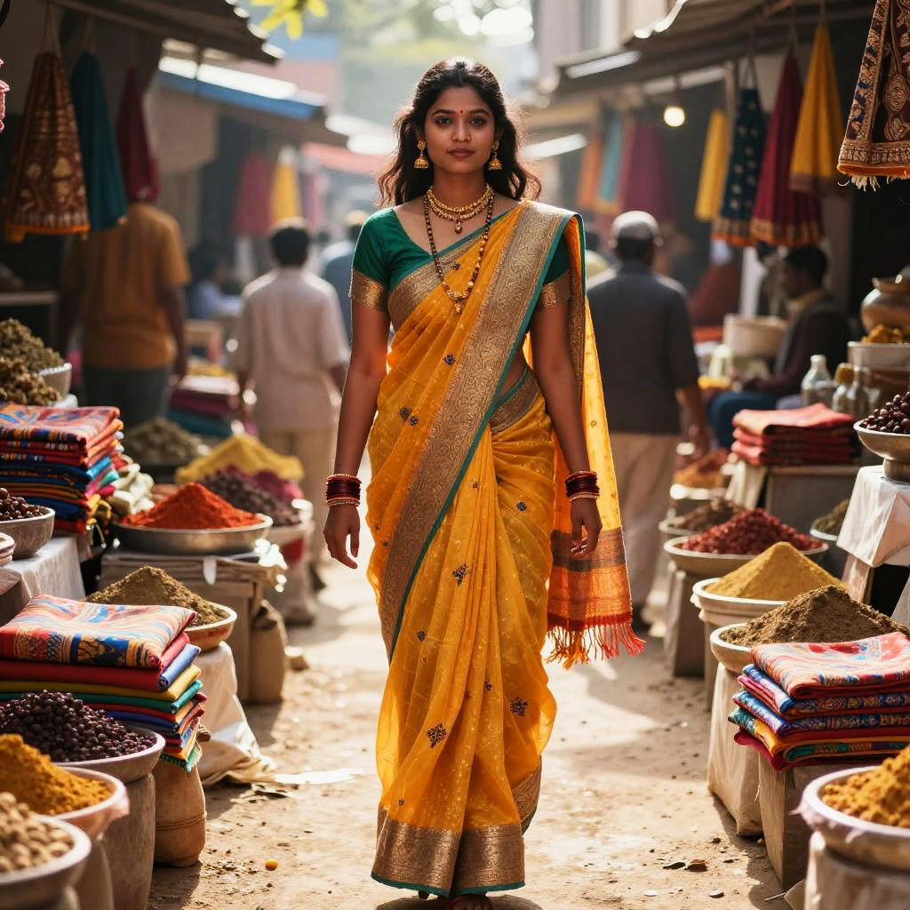 Indian young woman in traditional vibrant saree standing in a sunlit marketplace, colorful fabrics and spices around, festive and lively atmosphere, detailed textures