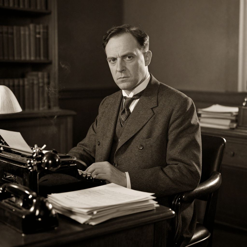 Black-and-white photograph of a serious, middle-aged man in a dark tweed suit, sitting at a desk with papers and a typewriter, in