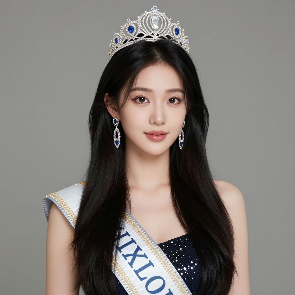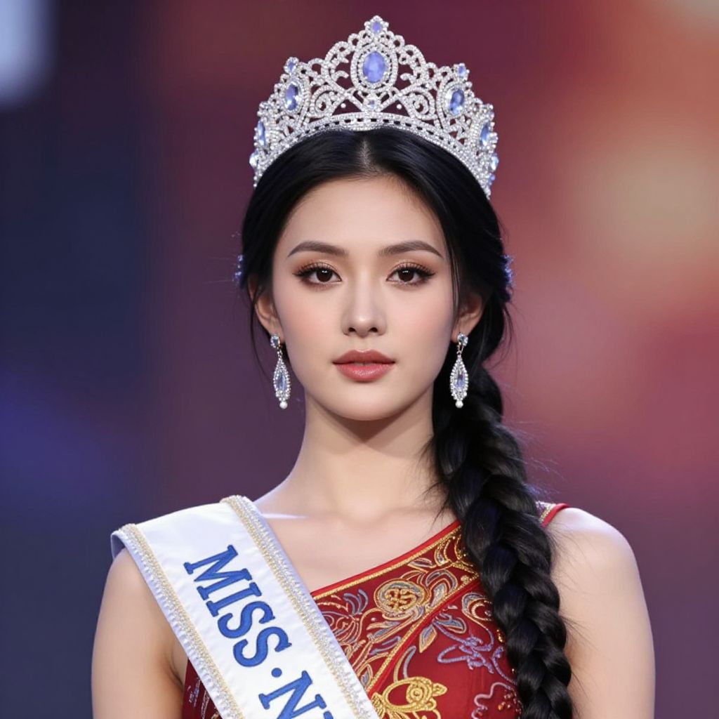 Photograph of an Asian beauty queen with long black braided hair, wearing a silver tiara, diamond earrings, red ornate dress, and "