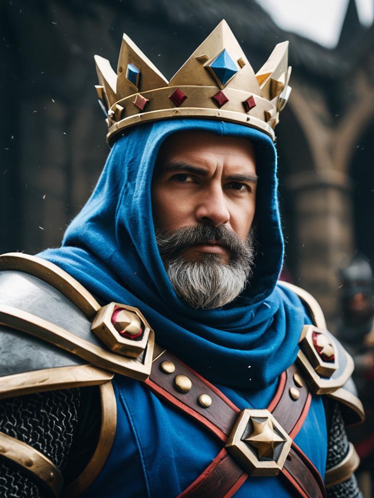 Man in Clash Royale King Costume, cinematic realism, heroic fantasy portrait