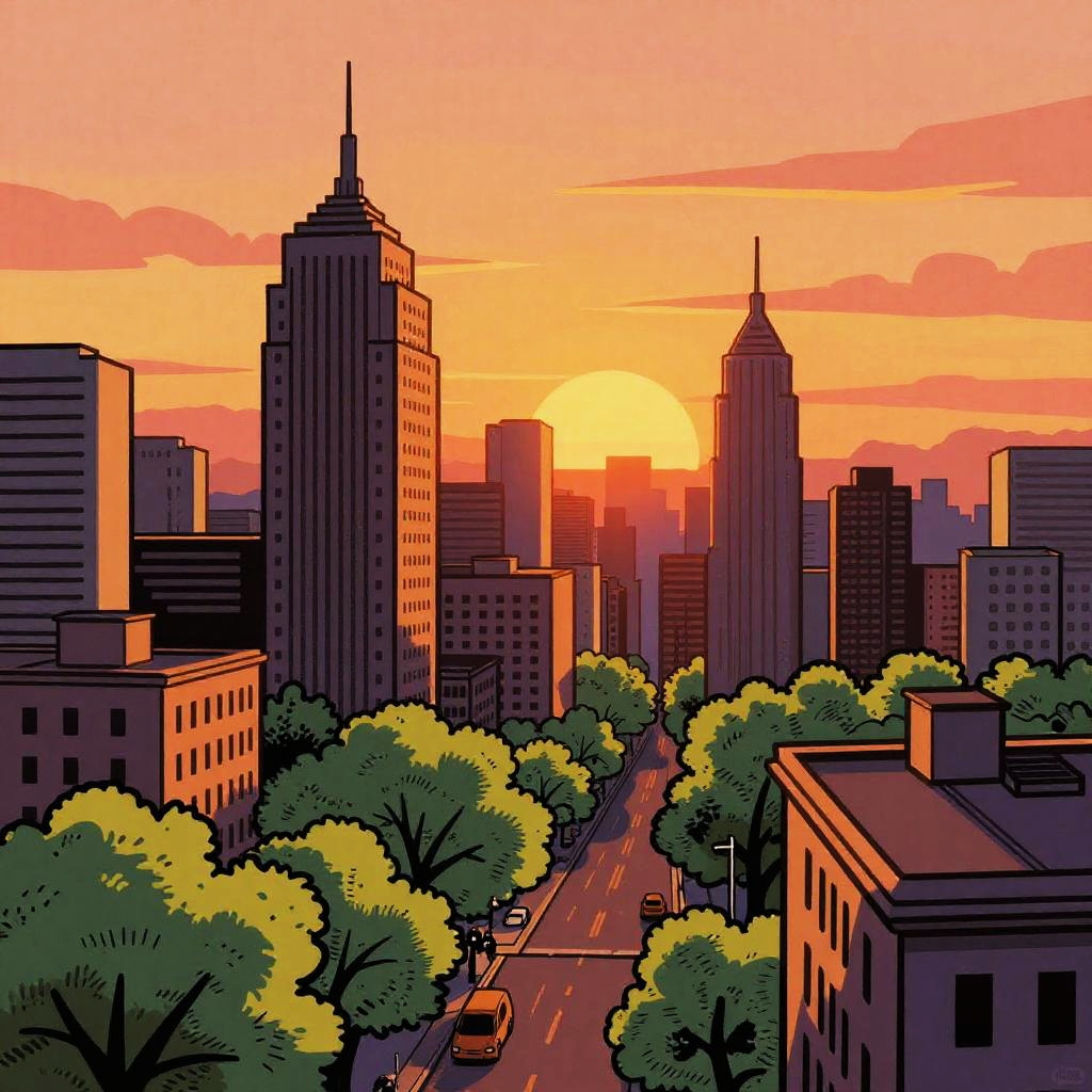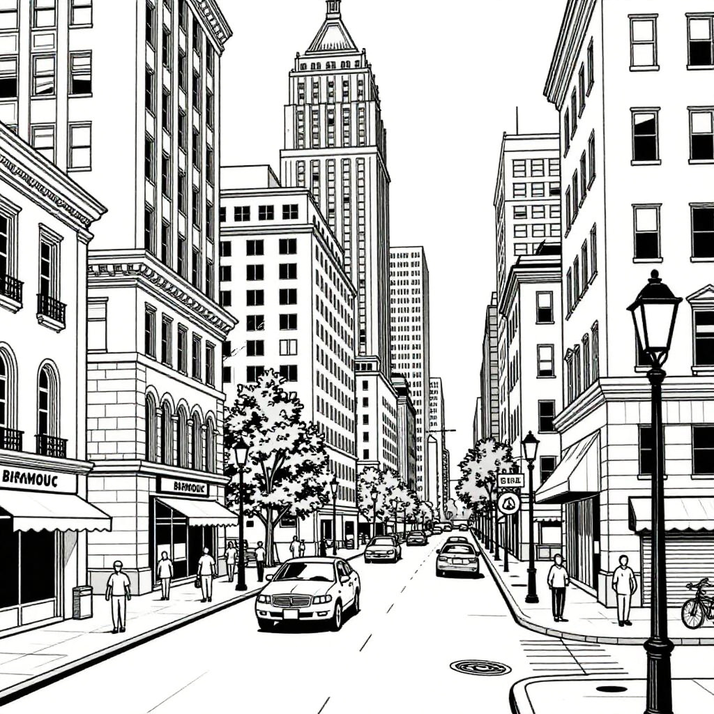 Black and white coloring pages illustrating urban cityscapes with detailed architecture and street scenes, emphasizing contrast and line work to captivate colorists of all ages.
