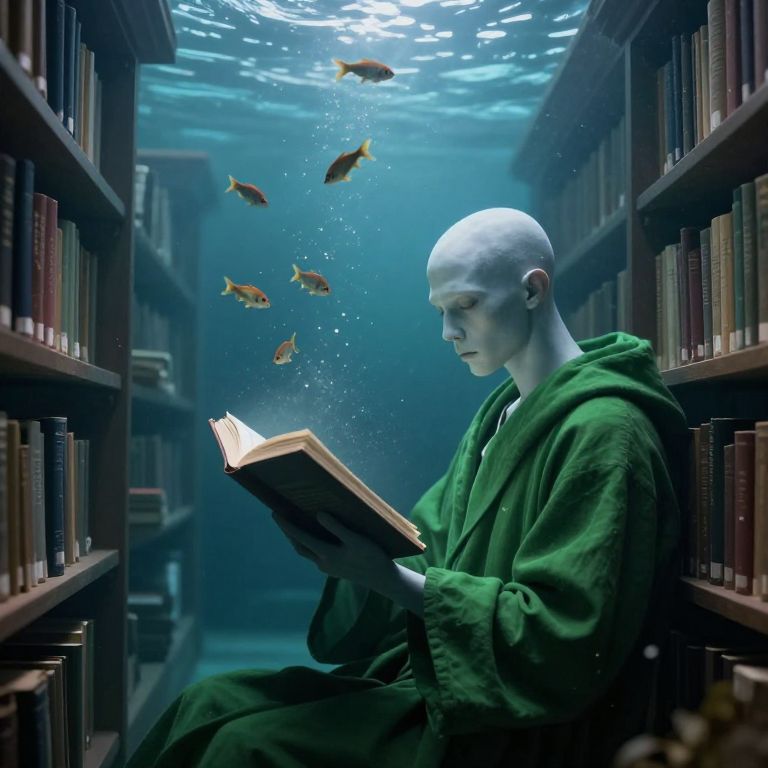 Photograph-style CGI: Bald, pale-skinned person in green robe reads underwater, surrounded by fish, in dimly lit library aisle.