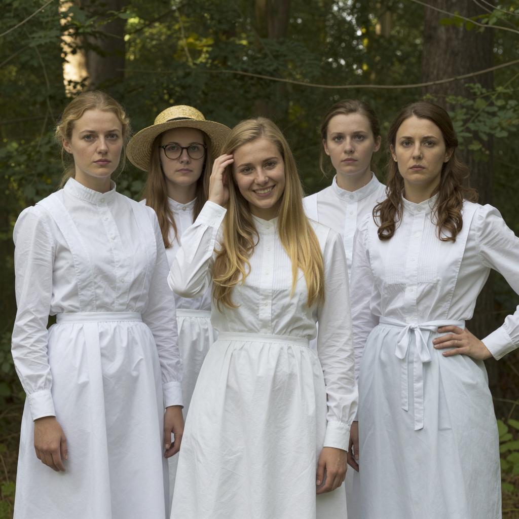 Five women standing outdoors in a forest setting, dressed in white, long-sleeved Victorian-style dresses with high collars and aprons. The central woman with long blonde hair smiles while touching her head. The others have light brown hair, with serious expressions; one wears a straw hat and glasses. Green foliage surrounds them, with natural sunlight filtering through the trees.