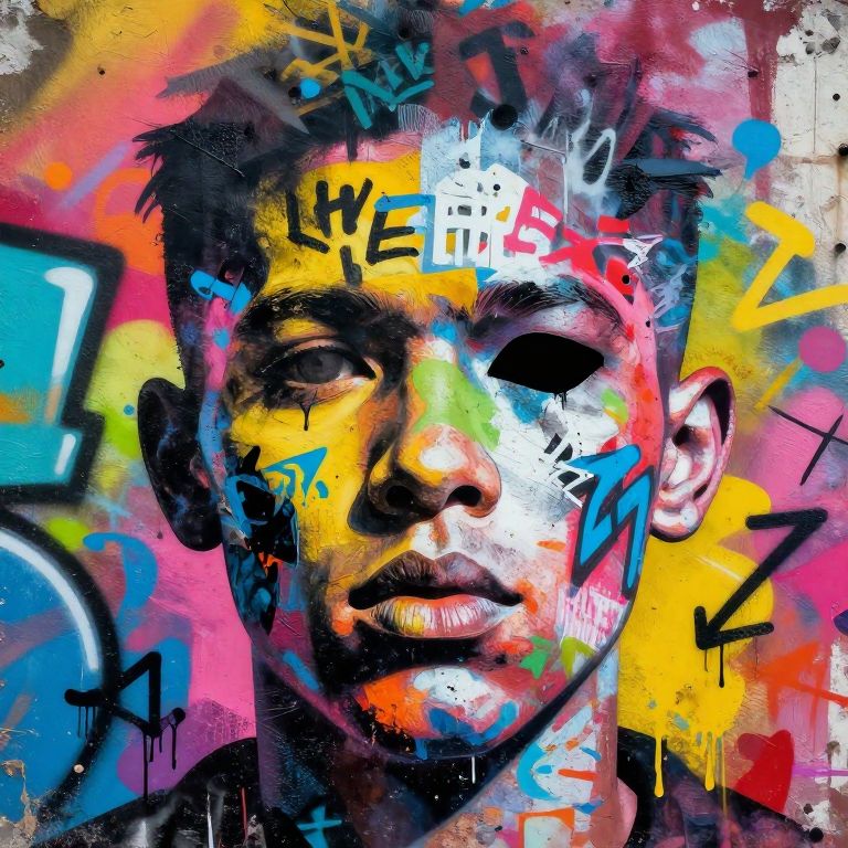 Cutout face merged with urban graffiti elements, bright spray paint textures and street art motifs, edgy and vibrant scene with layered stencils and paint drips, colorful and energetic city vibe, digital mixed media creation