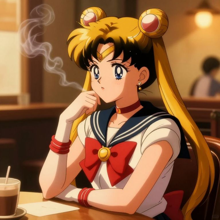 Sailor Moon smoking casually in a cozy cafe, warm golden light, vintage anime style, soft focus background, detailed character expression, relaxed yet contemplative mood