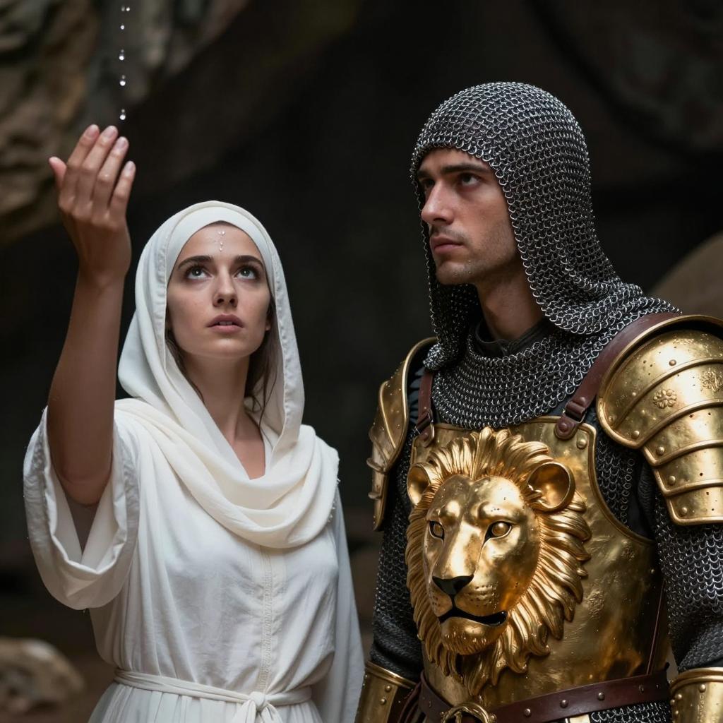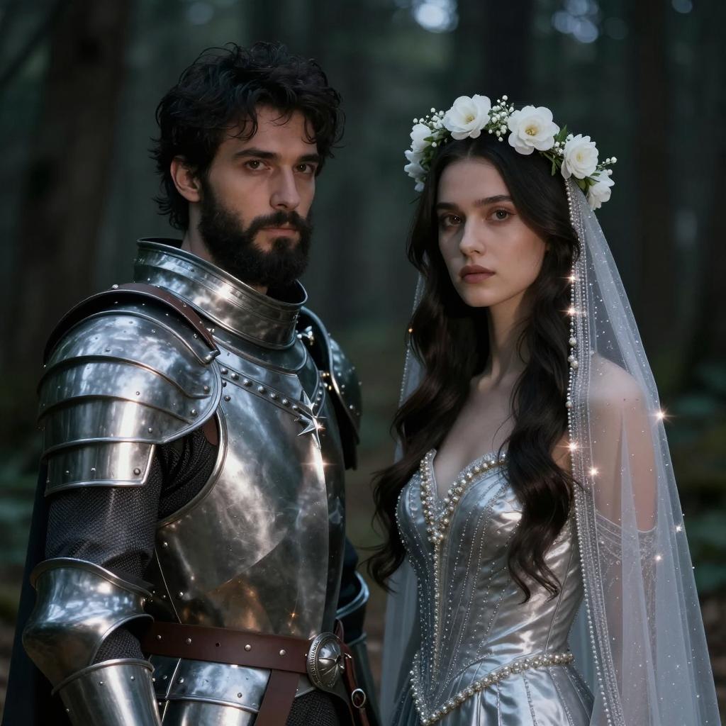 A man and woman in a dark forest. Man with dark beard, black hair, and metallic armor, looking to the side. Woman with long dark hair, white flower crown, and silver dress, wearing a veil with sparkling beads. Both illuminated by light flares. Man on the left, woman on the right. Man's armor reflects light, woman's veil has visible sparkles. Dark, blurry forest background. Both have serious expressions.