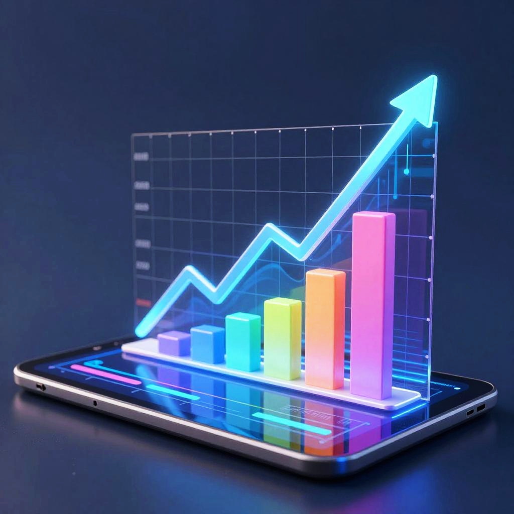 3D upward trend chart emerging from a tablet screen with colorful graphs and data streams, futuristic technology setting, vibrant colors with glowing effects, symbolizing financial growth and innovation