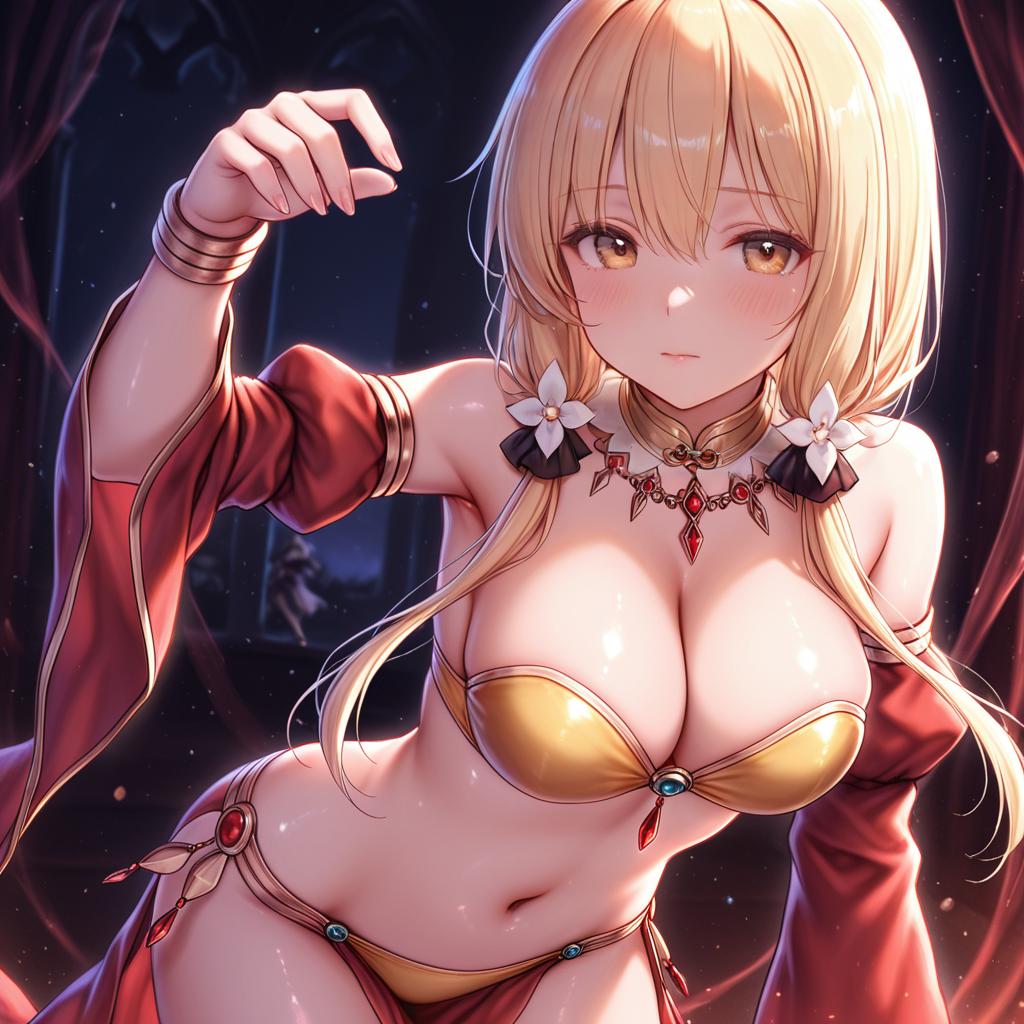 Gypsy (ragnarok online), ragnarok online, 1girl, hair between eyes, red eyes, long hair, blonde hair, short hair, medium breasts, large breasts, cleavage, navel, yellow bikini, strapless bikini, detached sleeves, red sleeves, necklace, dancer, by artist cai geng, dark_illustrious
