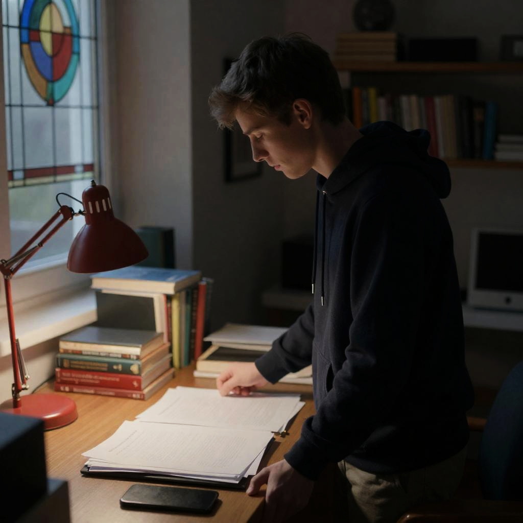 Young man with short brown hair, wearing a dark hoodie, standing at a cluttered desk. Red lamp on left, books and papers on desk. Background includes stained glass window, shelves with books, and electronic equipment. Dimly lit room.