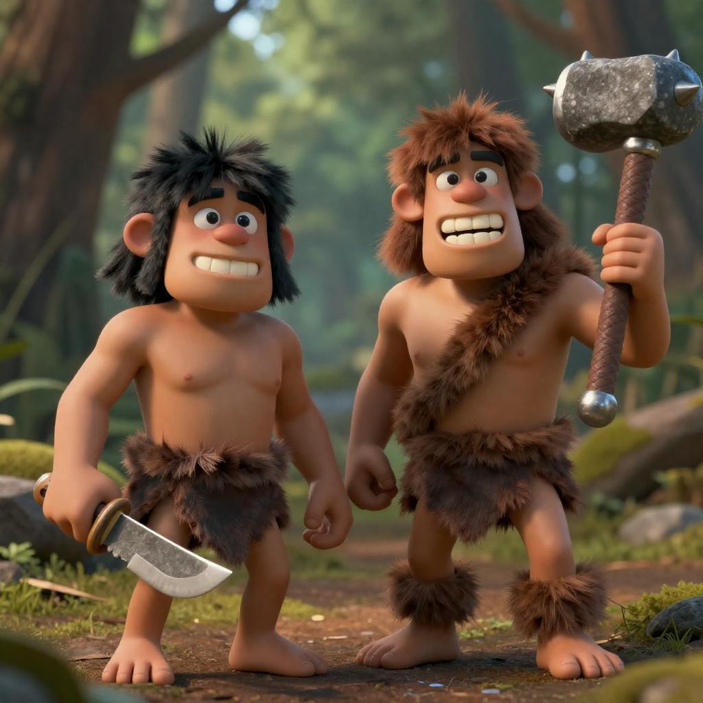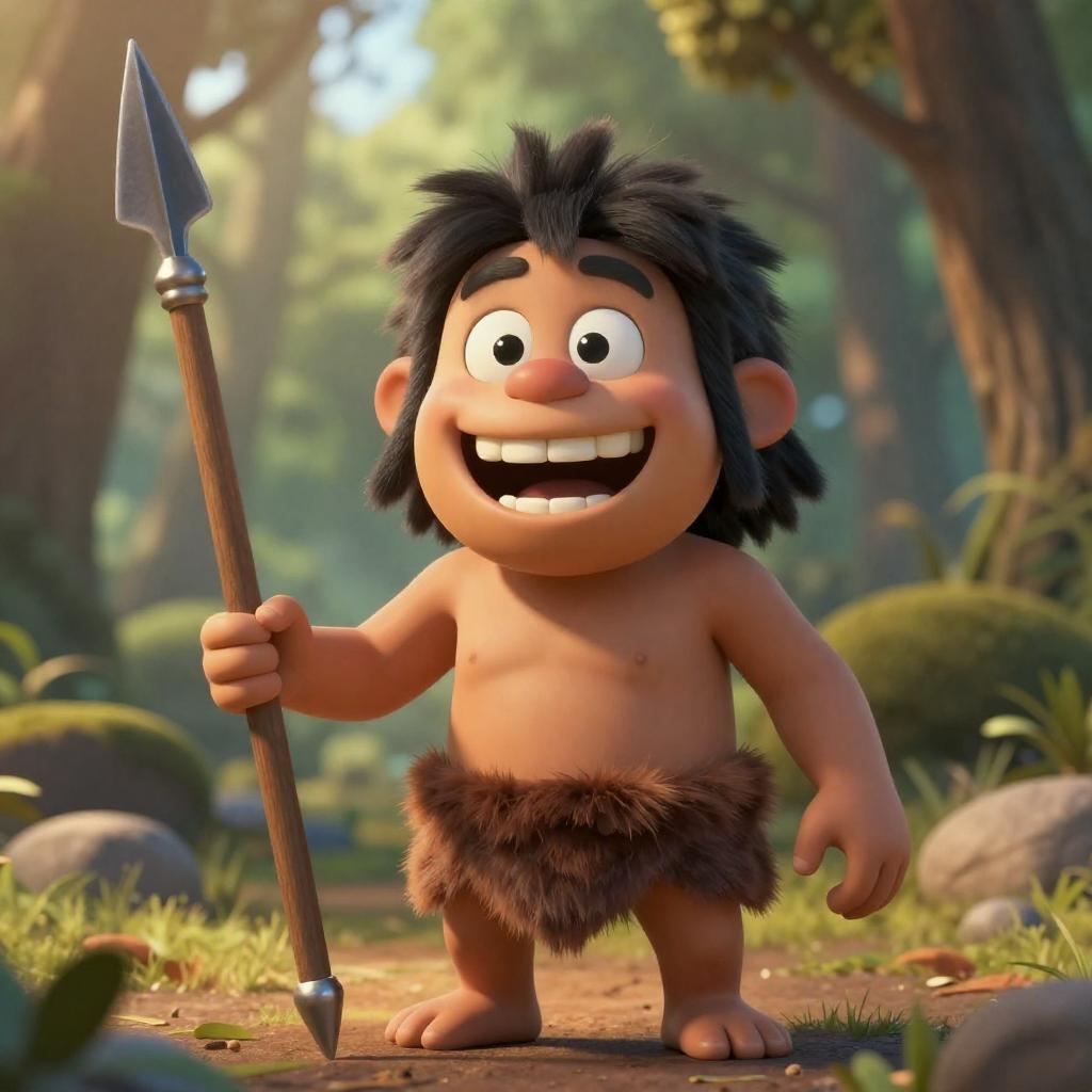 Digital illustration of a forest scene with a cartoon-style cavewoman standing barefoot on grass, wearing a fur loincloth and holding a wooden staff. She has dark hair and a fur headband. Beside her is a large, fluffy, brown bear-like creature standing on a rock. Sunlight filters through tall trees in the background.