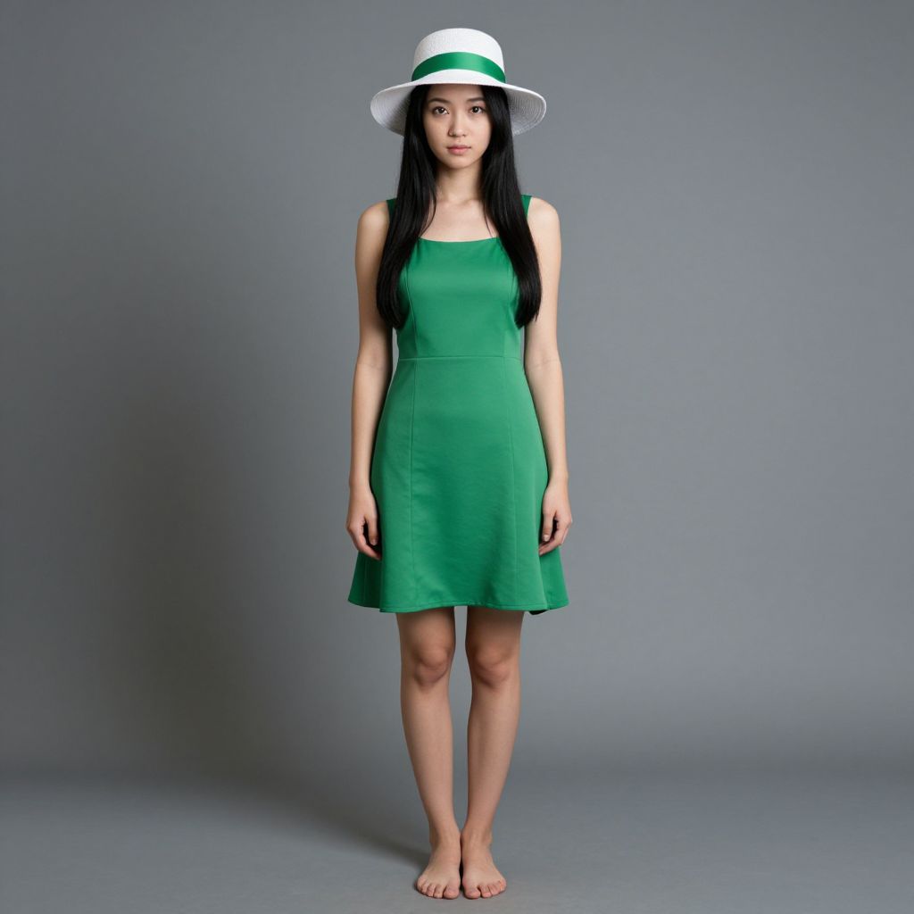 Crayon dress costume, 1girl, solo, long hair, black hair, full body, dress, hat, standing, looking at viewer, green dress, simple background, barefoot
