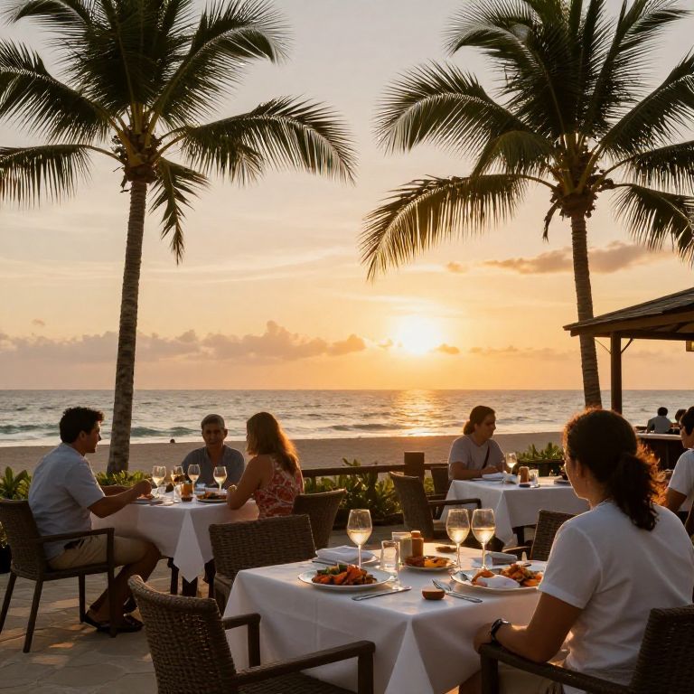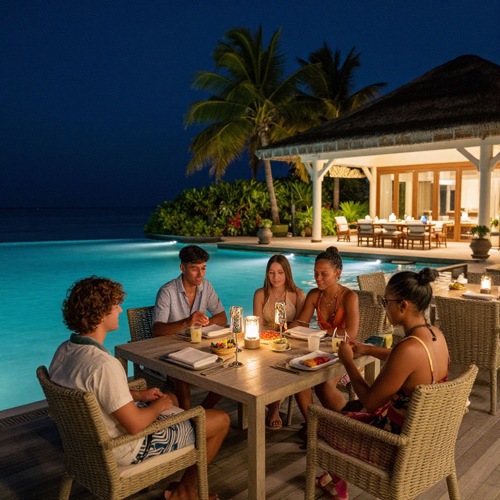 "Color Psychology a group of young men and women sitting around a table, the patio of an expensive resort in the Maldives, summer, night,"