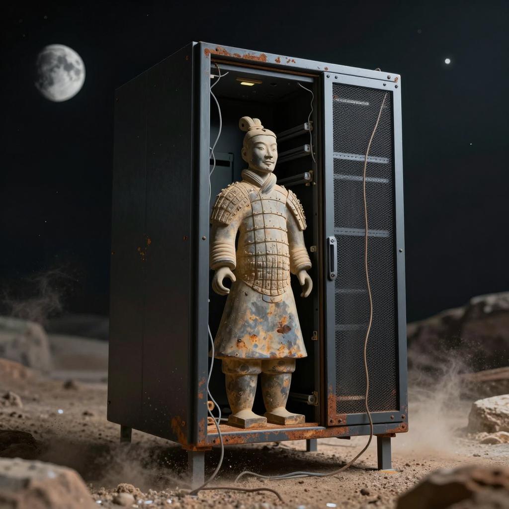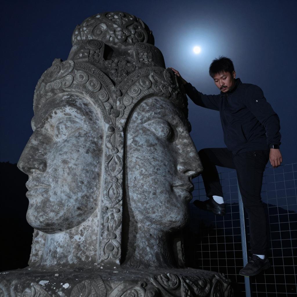 Photograph of a large stone statue with two prominent human-like faces, lit by blue moonlight. A man in dark clothing climbs a wire mesh fence on the right, gripping the mesh with his left hand. The man has short dark hair, a mustache, and is wearing a dark jacket and pants. The statue's faces are ured and weathered. The background includes a dark, cloudy night sky and faint mountain silhouettes.