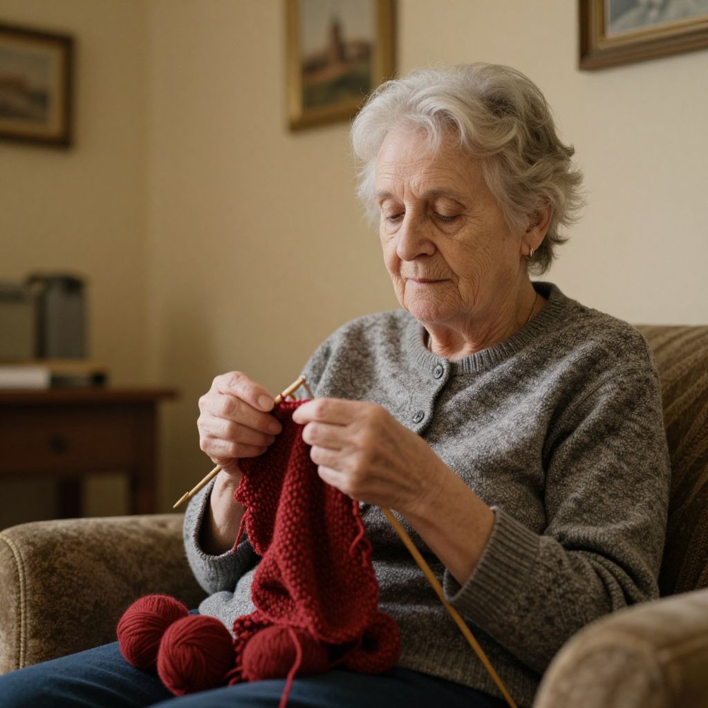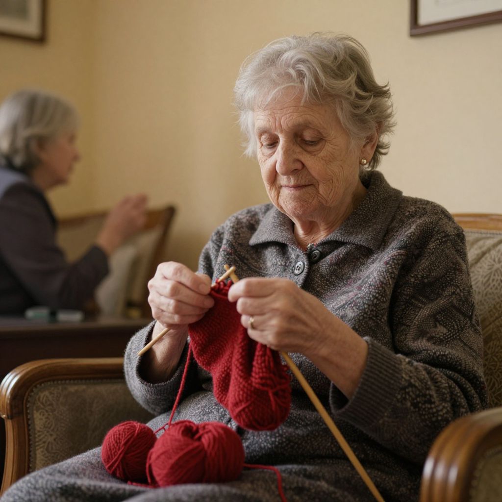 In a warmly lit room filled with the hum of conversation and the soft clacking of knitting needles, an elderly woman radiates serenity and purpose, her hands deftly weaving threads of red that symbolize the enduring warmth of life and the quiet strength of resilience.
