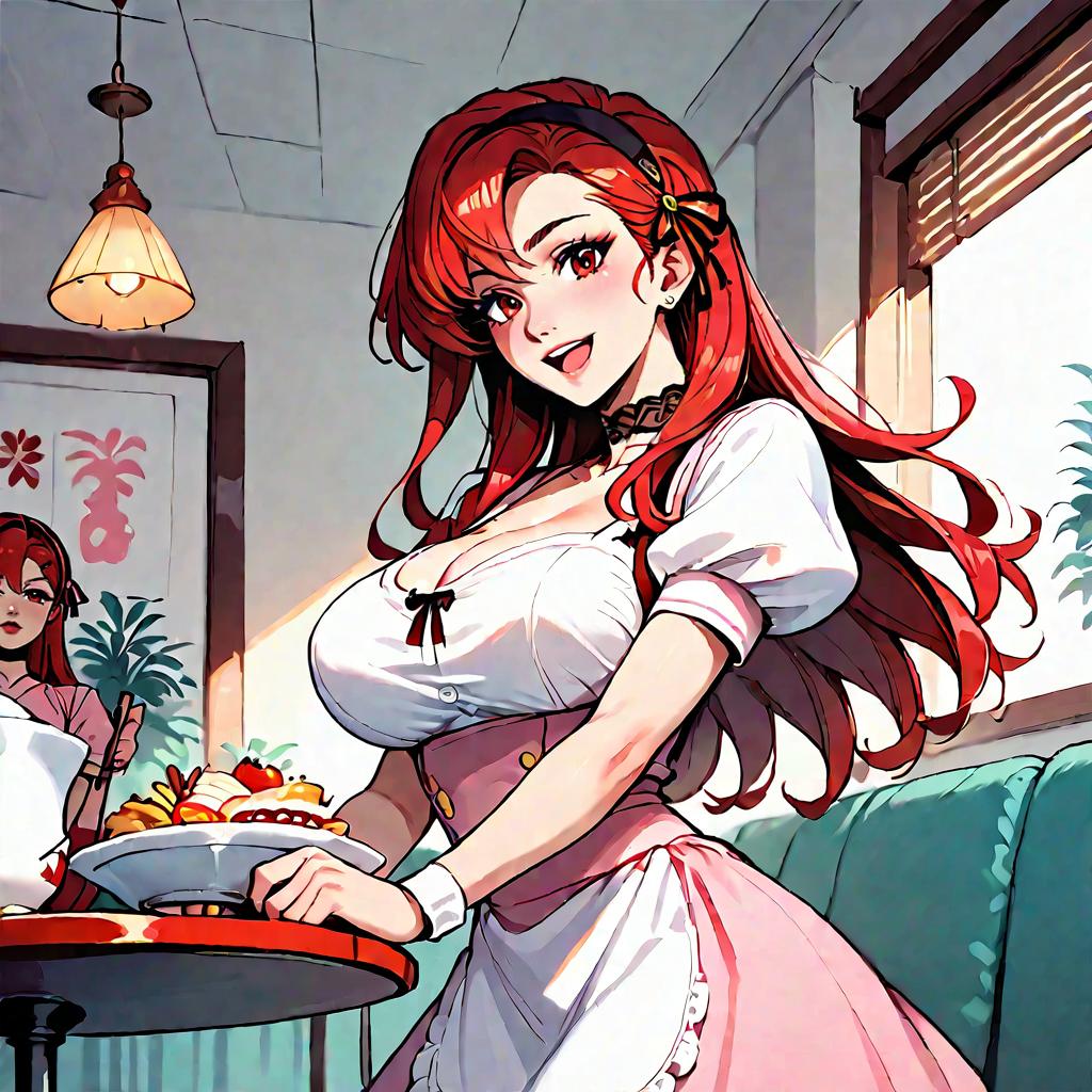 Frankie foster from Foster's Home for Imaginary Friends holding a cup of coffee in a coffee shop, (bellysag:1.2), huge belly, score_9, score_8_up, score_7_up, score_6_up, score_5_up