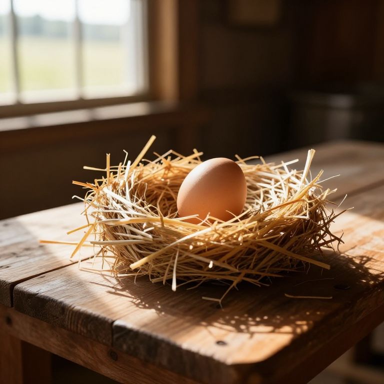 Huevo in a nest of straw on a wooden farm table with morning sunlight filtering through a nearby window, detailed textures of straw and shell visible, warm rustic country vibe, natural color palette, soft focus background of a barn interior.