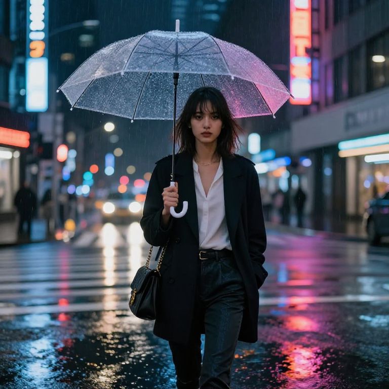 Streetwalker on a rainy city intersection at night, holding a transparent umbrella with raindrops cascading, neon signs glowing in the background, dressed in modern streetwear with an urban futuristic aesthetic, moody and vibrant atmosphere.