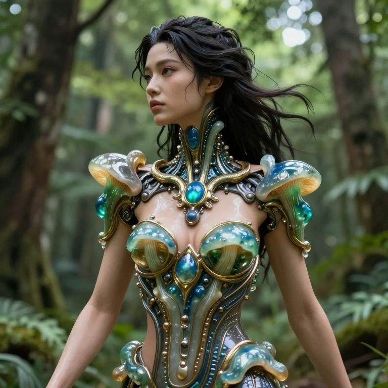 The image depicts a highly detailed, hyper-realistic humanoid figure with a striking and intricate design. The figure's neck and upper torso are adorned with elaborate, biomimetic jewelry that resembles futuristic mushrooms and liquid ceramic, featuring a mix of metallic and translucent elements. The jewelry is adorned with vibrant colors, including shades of blue, green, and gold, creating a visually captivating contrast against the figure's skin. The figure's hair is dark and styled in a flowing manner, complementing the overall aesthetic. The background is a lush, green forest, with sunlight filtering through the leaves, adding a natural and serene atmosphere to the scene. The figure's posture is poised and confident, with a sense of motion and grace, as if it is walking through the forest. The overall composition is balanced, with the figure centrally positioned and the jewelry drawing the viewer's attention. The image is a stunning example of advanced 3D rendering, showcasing intricate details and a high level of realism.