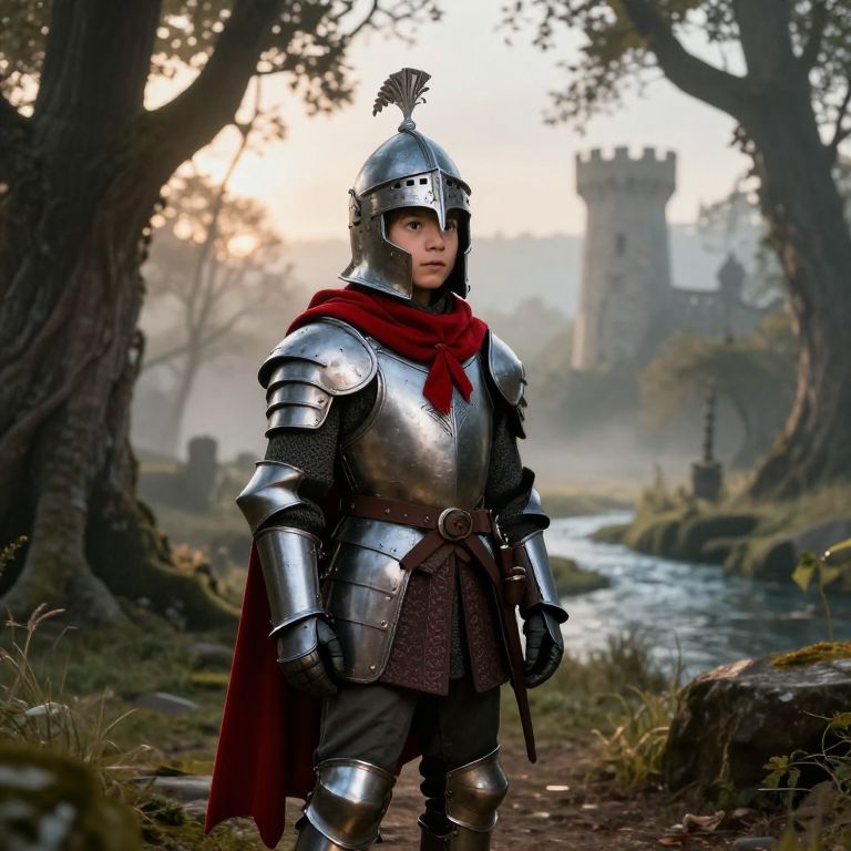 A young boy stands confidently in a medieval-inspired setting, dressed in intricately crafted armor featuring a polished steel helmet with a decorative crest, a chest plate, and padded leggings. He wears a vibrant red scarf tied around his neck, adding a touch of warmth and personality to his outfit. His expression is curious and adventurous, with wide eyes reflecting the sunlight filtering through ancient trees. The background shows a misty forest at dawn, with distant stone towers and a winding river, evoking a timeless, magical atmosphere. The scene is rendered in rich, detailed textures with a soft, cinematic lighting style.