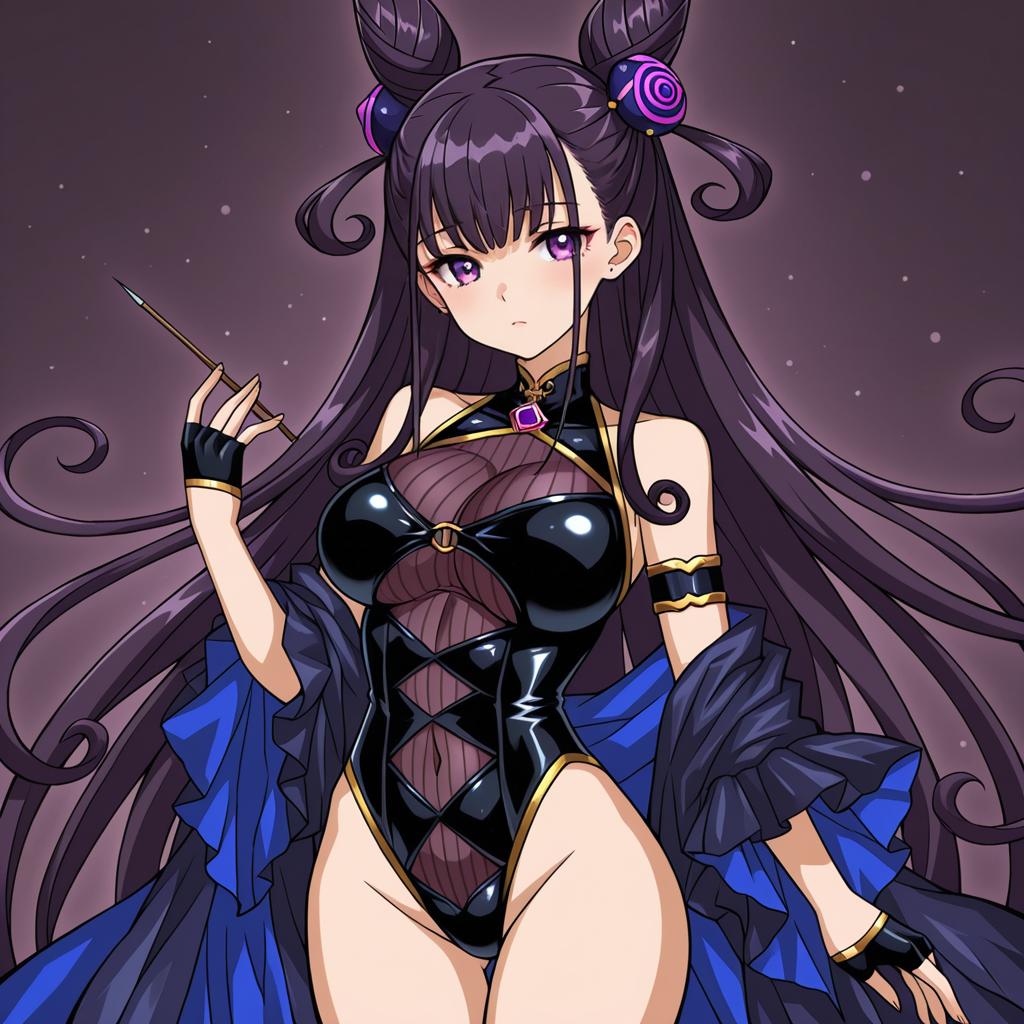 Murasaki shikibu (swimsuit rider) (first ascension) (fate), fate/grand order, 1girl, purple eyes, long hair, purple hair, tied hair, black hair, hair flower, large breasts, thighs, covered navel, black one-piece swimsuit, highleg swimsuit, half gloves, fingerless gloves, black gloves, bare shoulders, gold trim, armlet, shawl, by artist rifyu, dark_illustrious