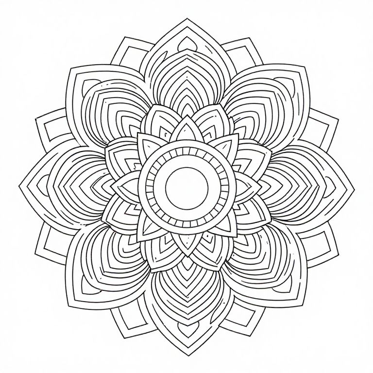 Symmetrical mandala design featuring intricate floral patterns radiating outward from a central circular core, surrounded by layered petals and geometric shapes, ready for creative coloring.