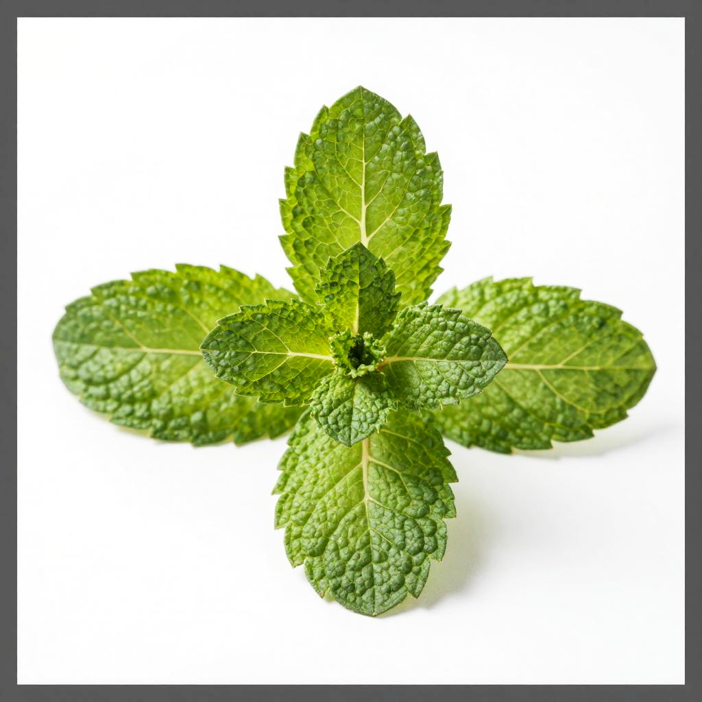 A close-up photograph of a fresh green mint sprig with four broad, textured leaves and a small, unopened bud in the center. The sprig is placed against a stark white background, highlighting its vibrant green color and detailed leaf veins. The image has a dark gray border on the top and bottom edges.