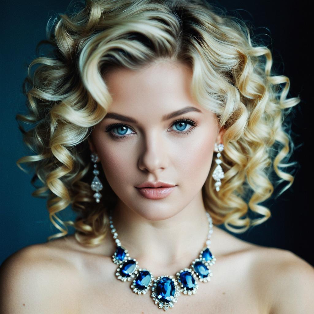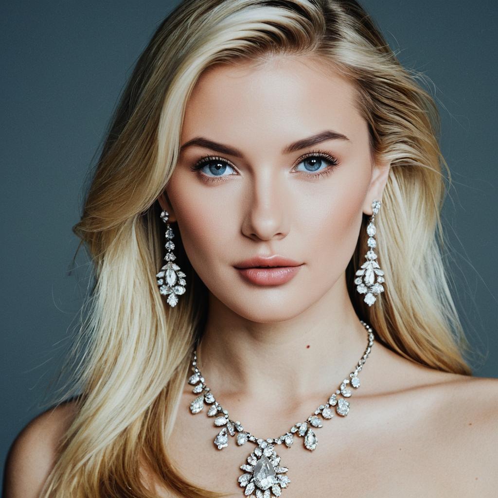 Brazilian wig hair ,1girl, solo, jewelry, long hair, earrings, blonde hair, looking at viewer, realistic, necklace, wavy hair, lips, upper body, breasts, choker
