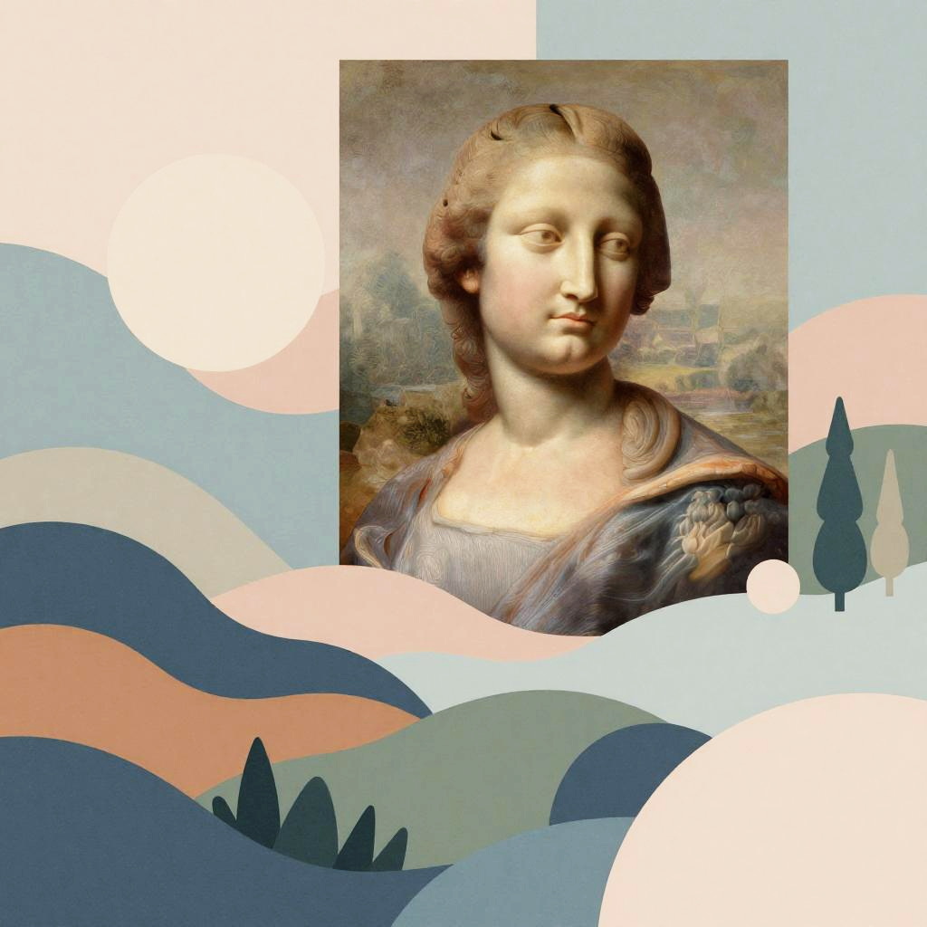 AI art based on image, imaginative transformation of a classical photo into a dreamlike landscape with abstract forms, pastel color palette mixed with vivid hues, soft lighting, layered geometric shapes, combining realism with digital abstraction, high detail and depth