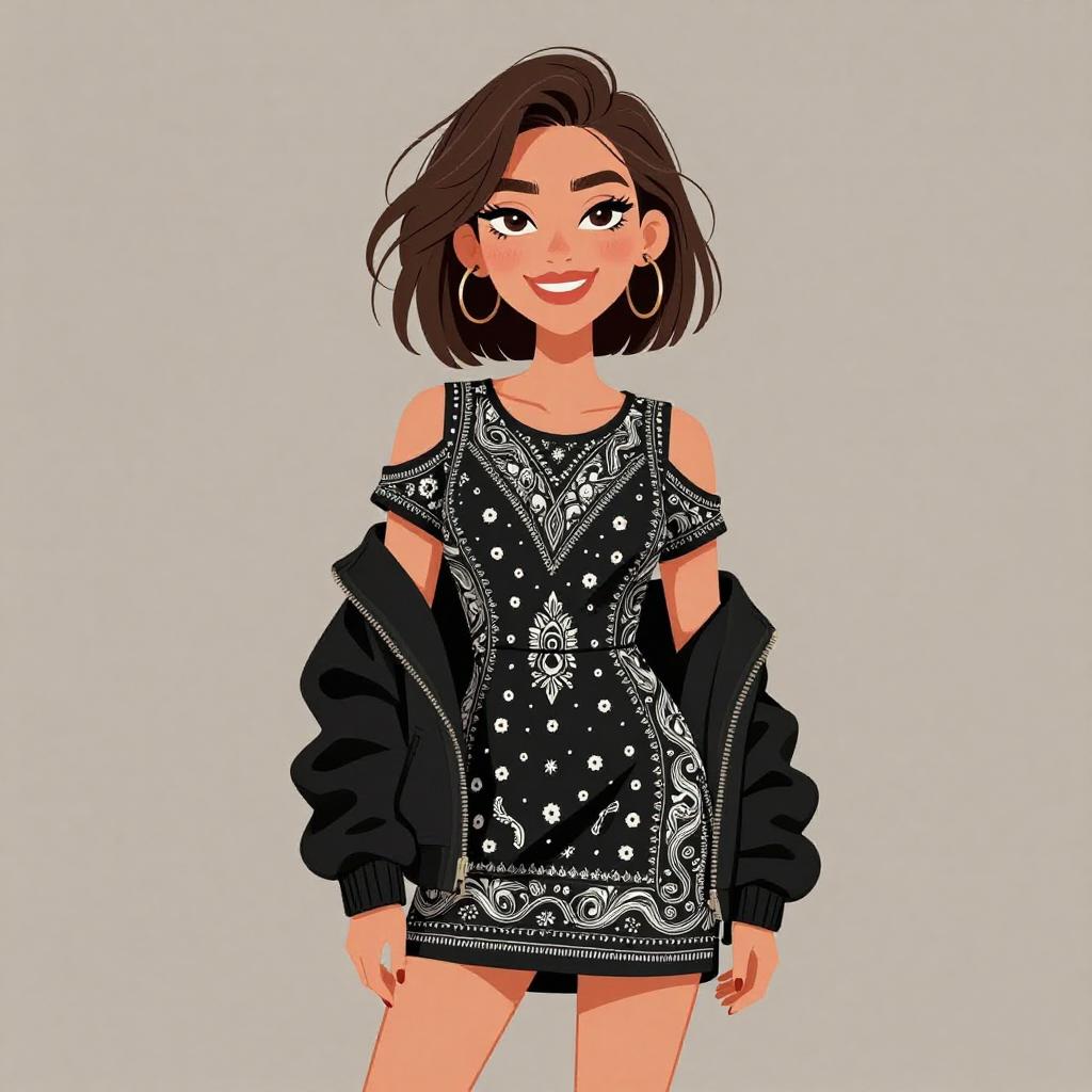 Digital illustration of a smiling woman with long brown hair, wearing a red and black lace-patterned dress, standing against a white background.