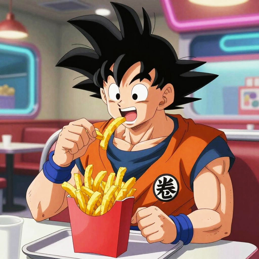 Goku fries fusion, Goku sitting at a futuristic diner eating extra large fries, neon-lit background, animated style, expressive character design, vibrant and lively scene