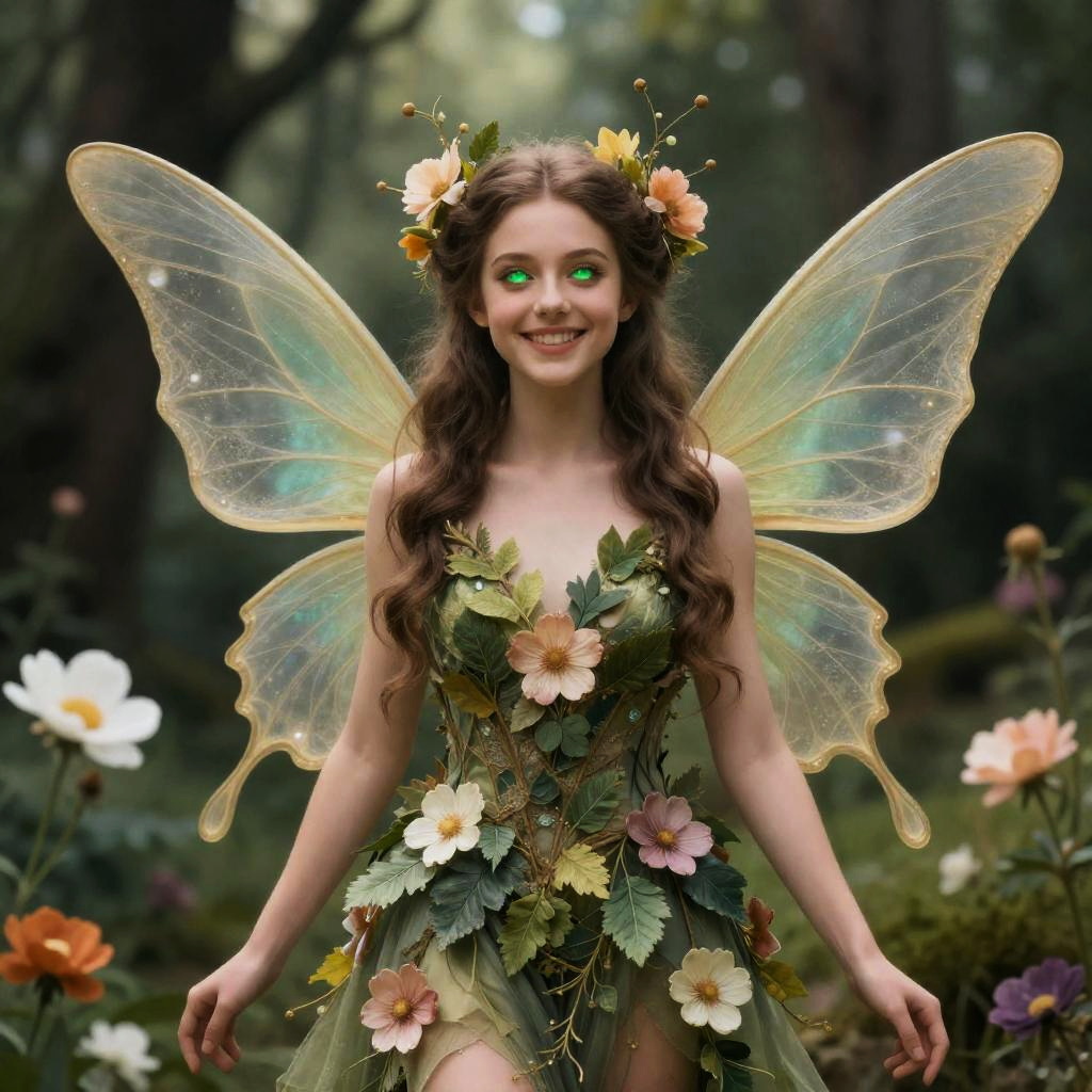 Realistic photo of a mystical forest nymph with radiant green eyes and an enchanting smile. She wears a detailed floral dress made of leaves and petals and has large translucent wings. Her hair is adorned with flowers, and she stands in a dreamy forest setting surrounded by blooming flowers and lush greenery.