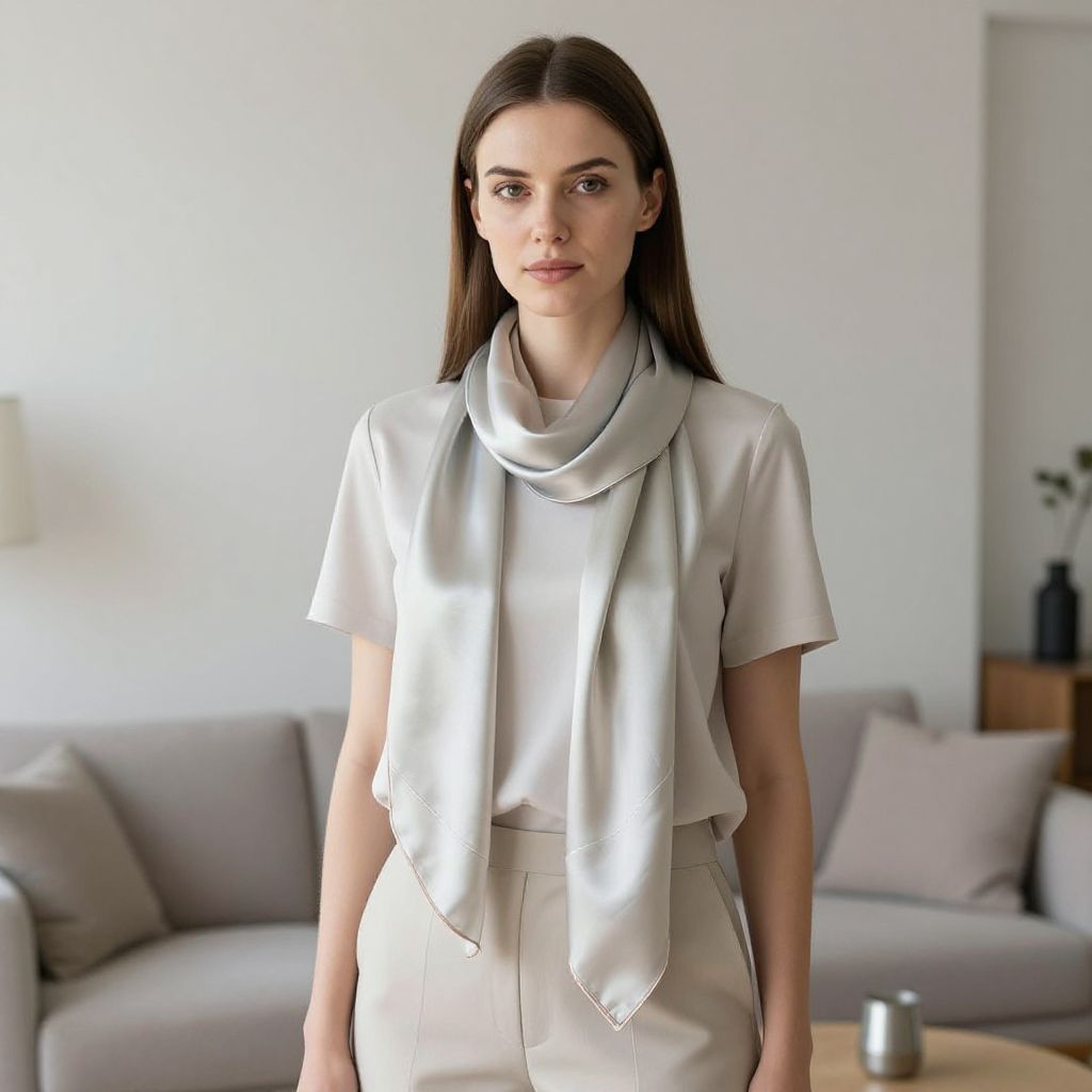 Caucasian woman with sleek, straight long hair, wearing a simple silk scarf and neutral outfit, standing in a minimalist living room, natural daylight, elegant and composed, polished professionalism, clean design aesthetic, Flux-style rendering.