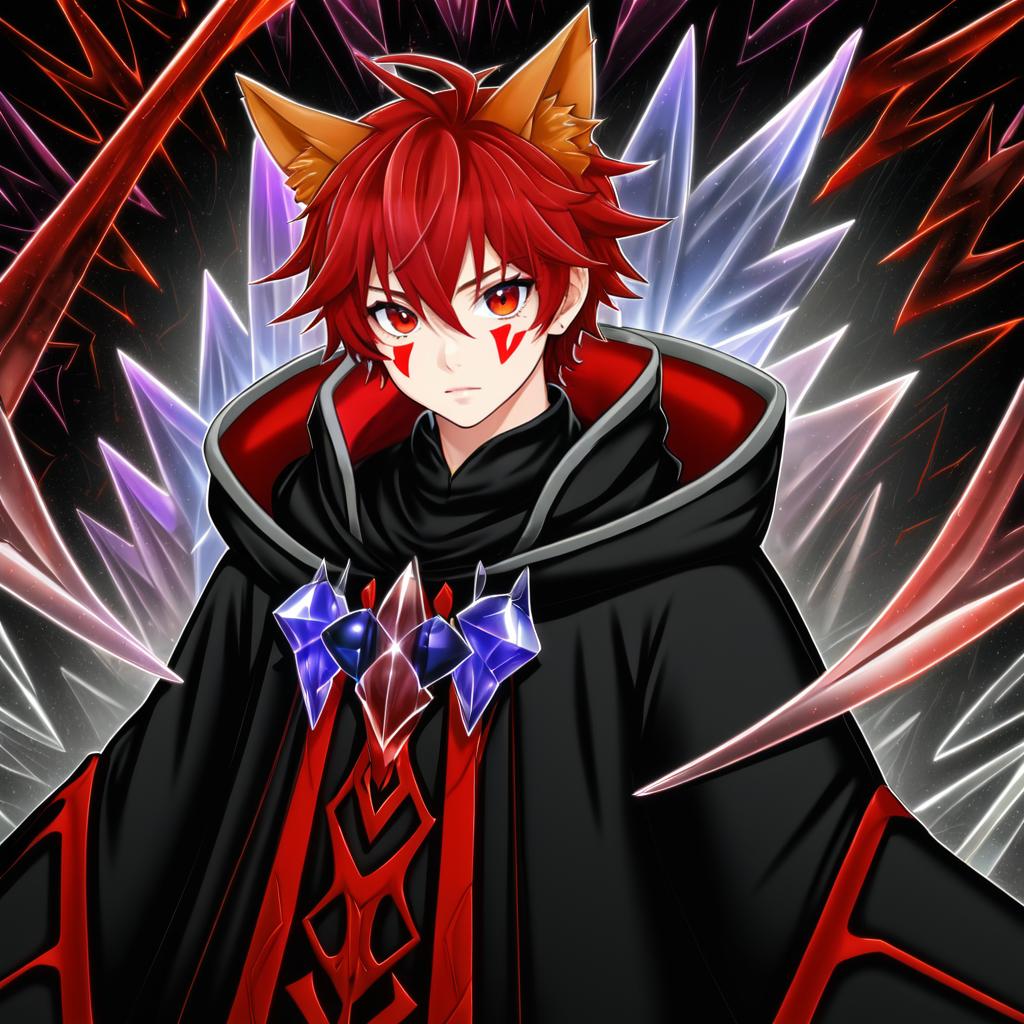 Digital anime-style illustration of a red-haired male cat boy with red eyes and slit pupils wearing a black and red hooded robe with the hood down. The character has brown cat ears, facial red markings, and crystal decorations on the robe. The background features glowing crystal shards and dynamic energy effects, inspired by fantasy themes.