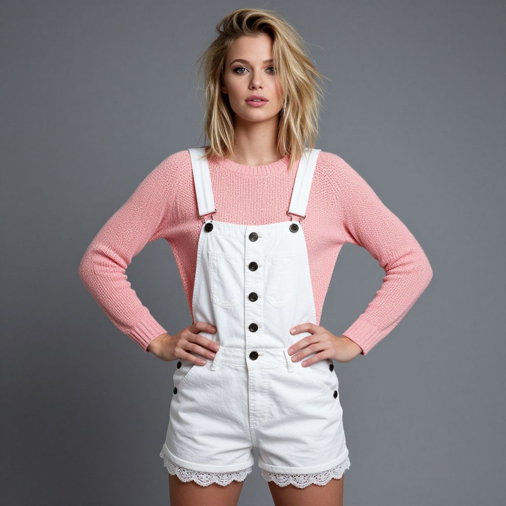 Photograph of a blonde woman with shoulder-length, slightly messy hair, wearing a pink, knitted, long-sleeve sweater and white denim overalls with black buttons. She's standing against a plain gray background, with her hands on her hips, giving a confident look. Her overalls have lace trim at the hem, and she's wearing subtle makeup. The overall style is casual and trendy.