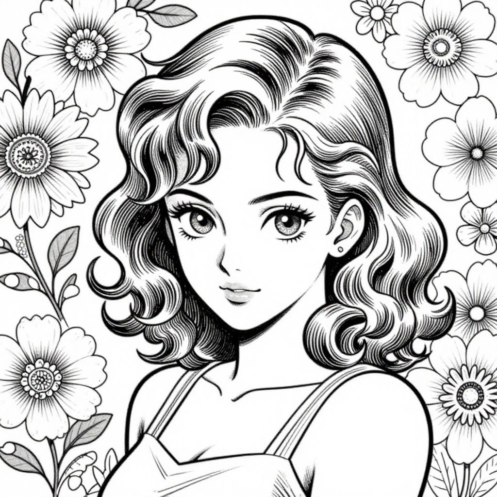 A vintage-style manga illustration featuring a confident young woman with curly hair, set against a charming floral background, rendered in black-and-white line art reminiscent of classic coloring book pages.