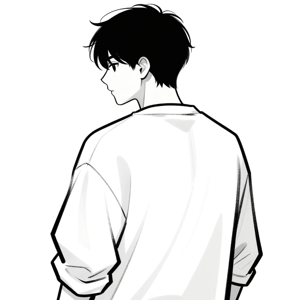 This is a black-and-white digital drawing of a person with a short, dark haircut, shown from the back and slightly turned to the side. The person is wearing a loose, long-sleeved shirt with visible creases and folds, adding a sense of texture. The stark contrast between the black and white makes the silhouette stand out sharply against the white background.